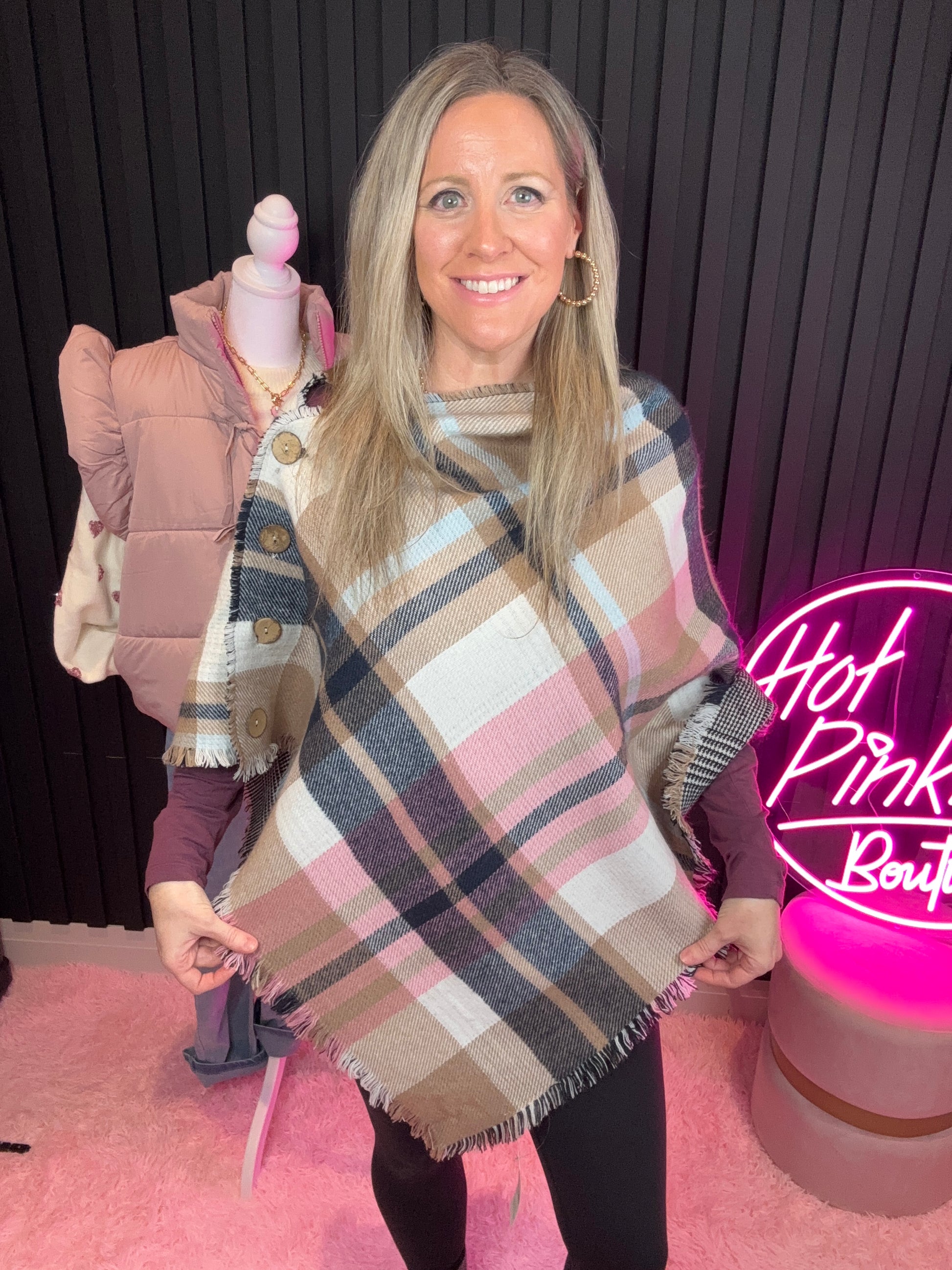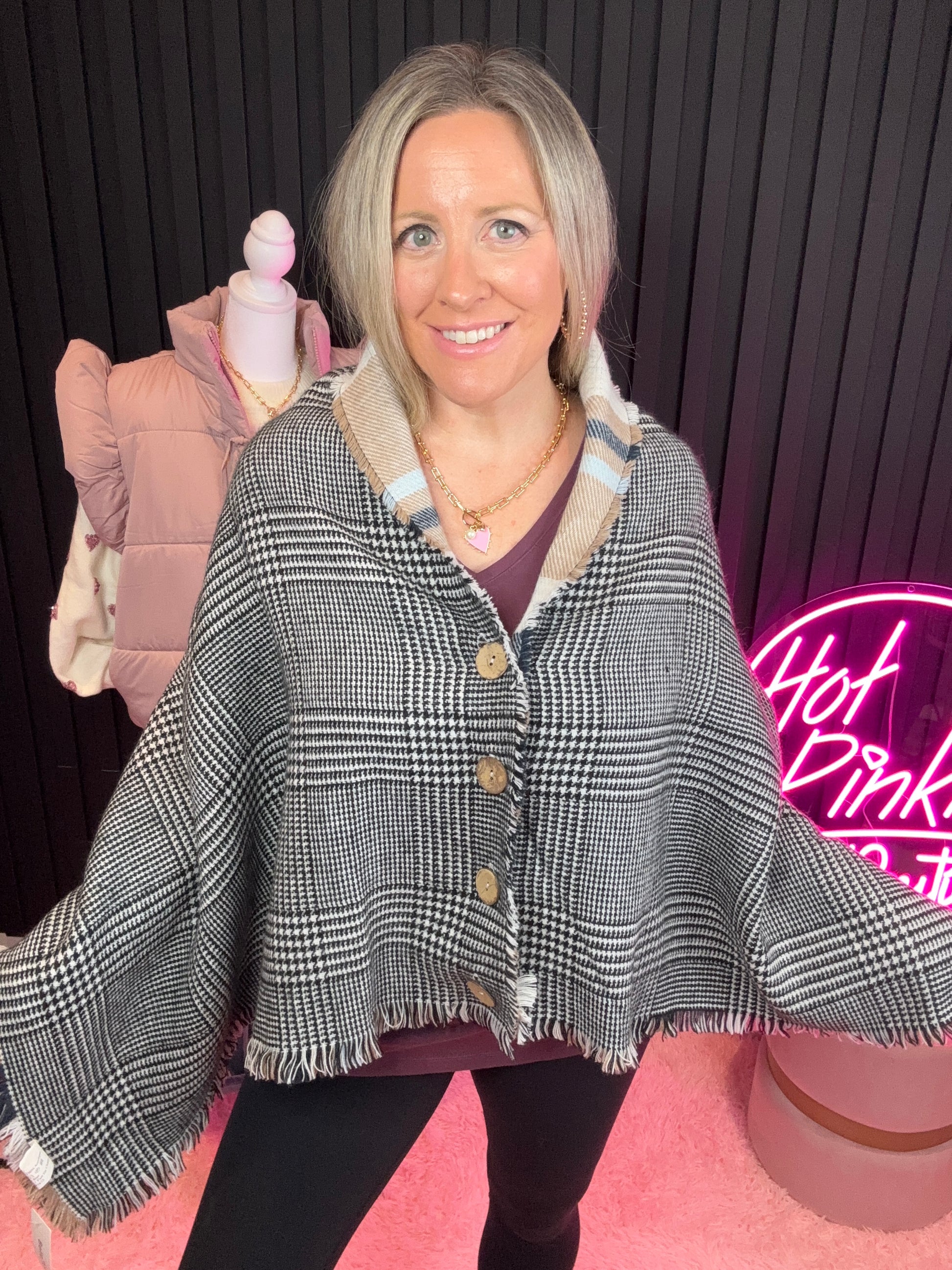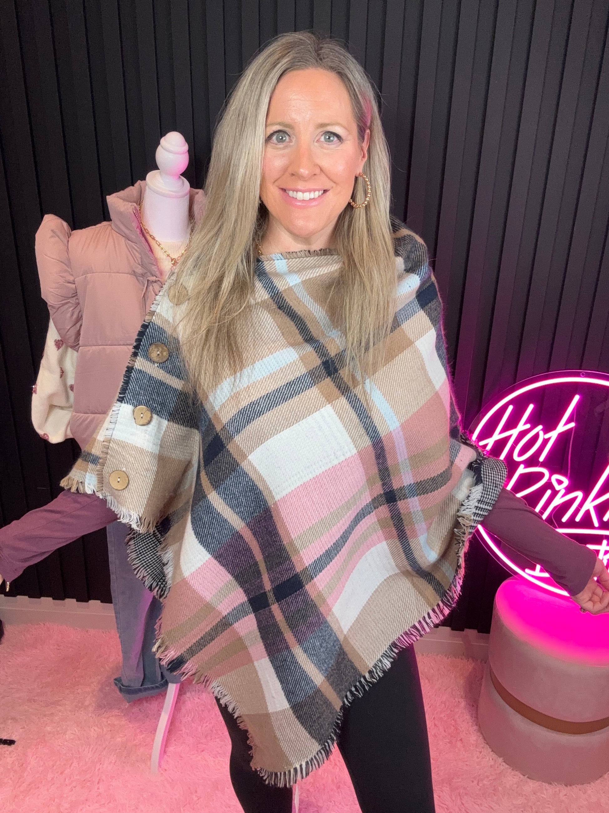Detail: Plaid poncho shawl with functional faux wood buttons that can also be worn as a blanket scarf.