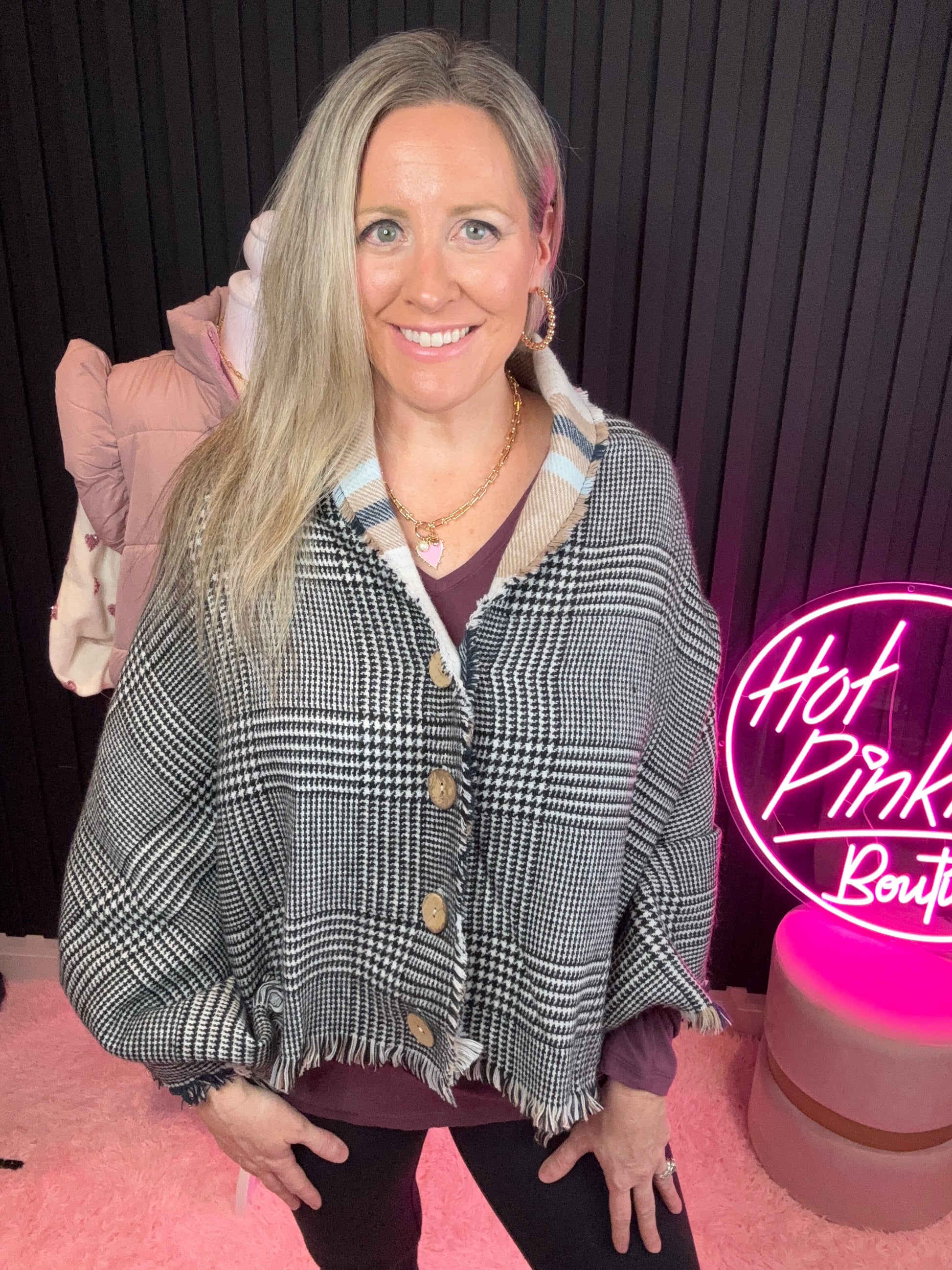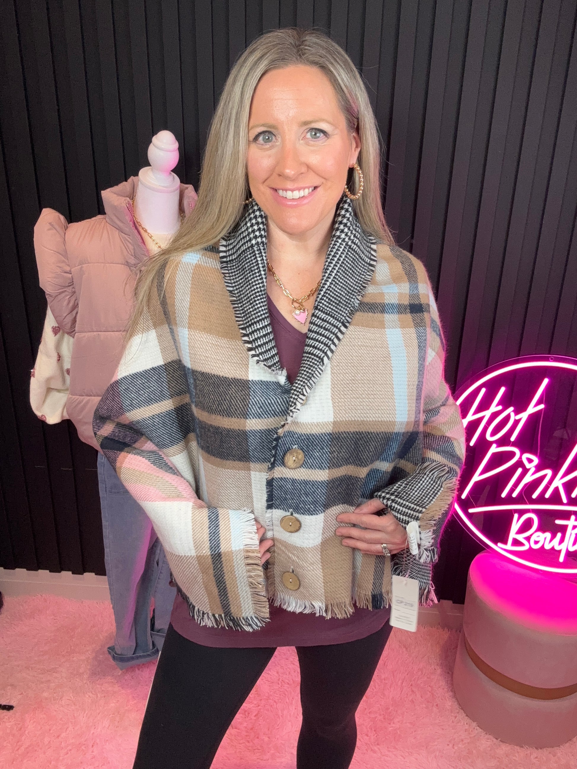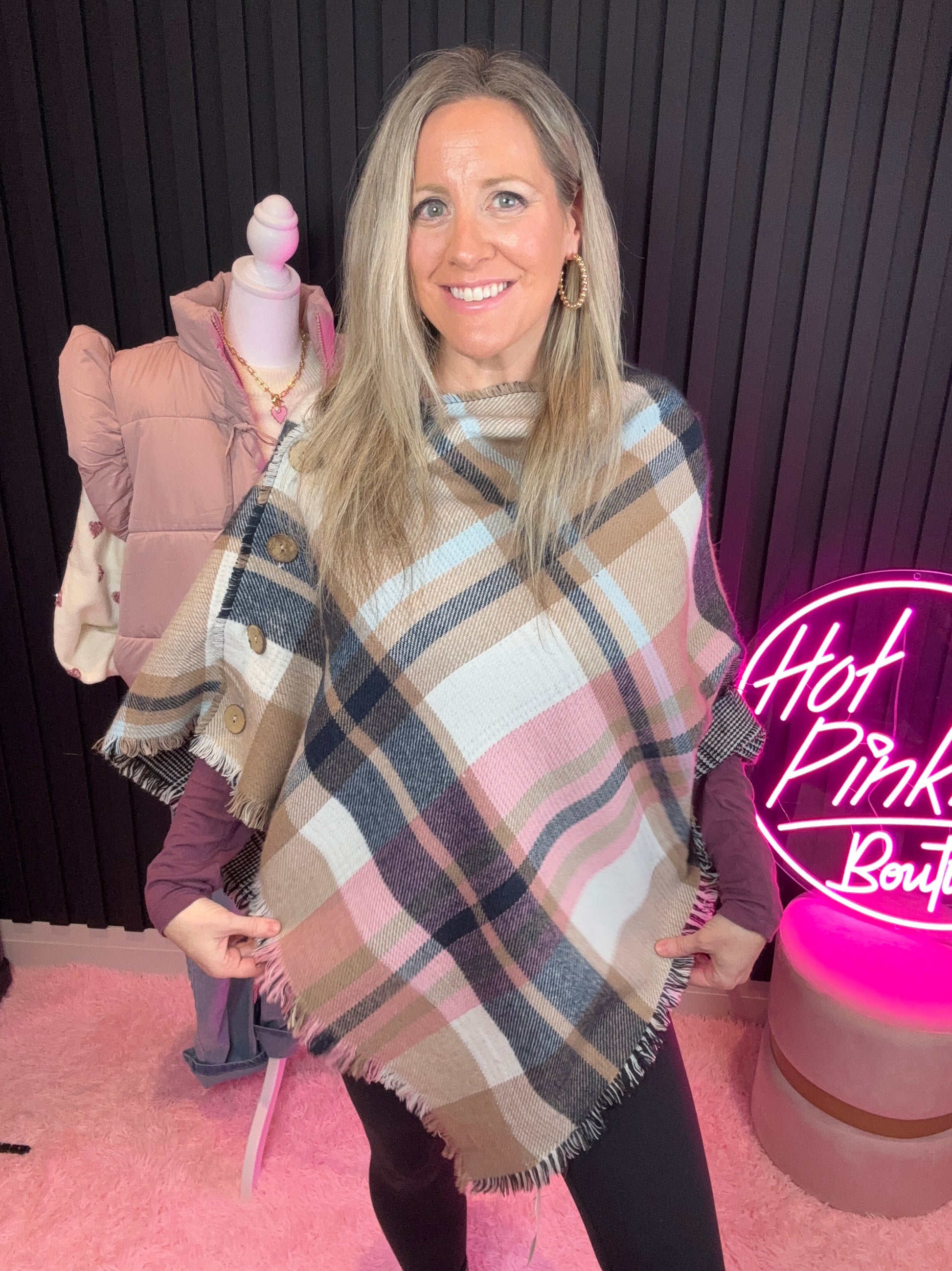 Detail: Plaid poncho shawl with functional faux wood buttons that can also be worn as a blanket scarf.