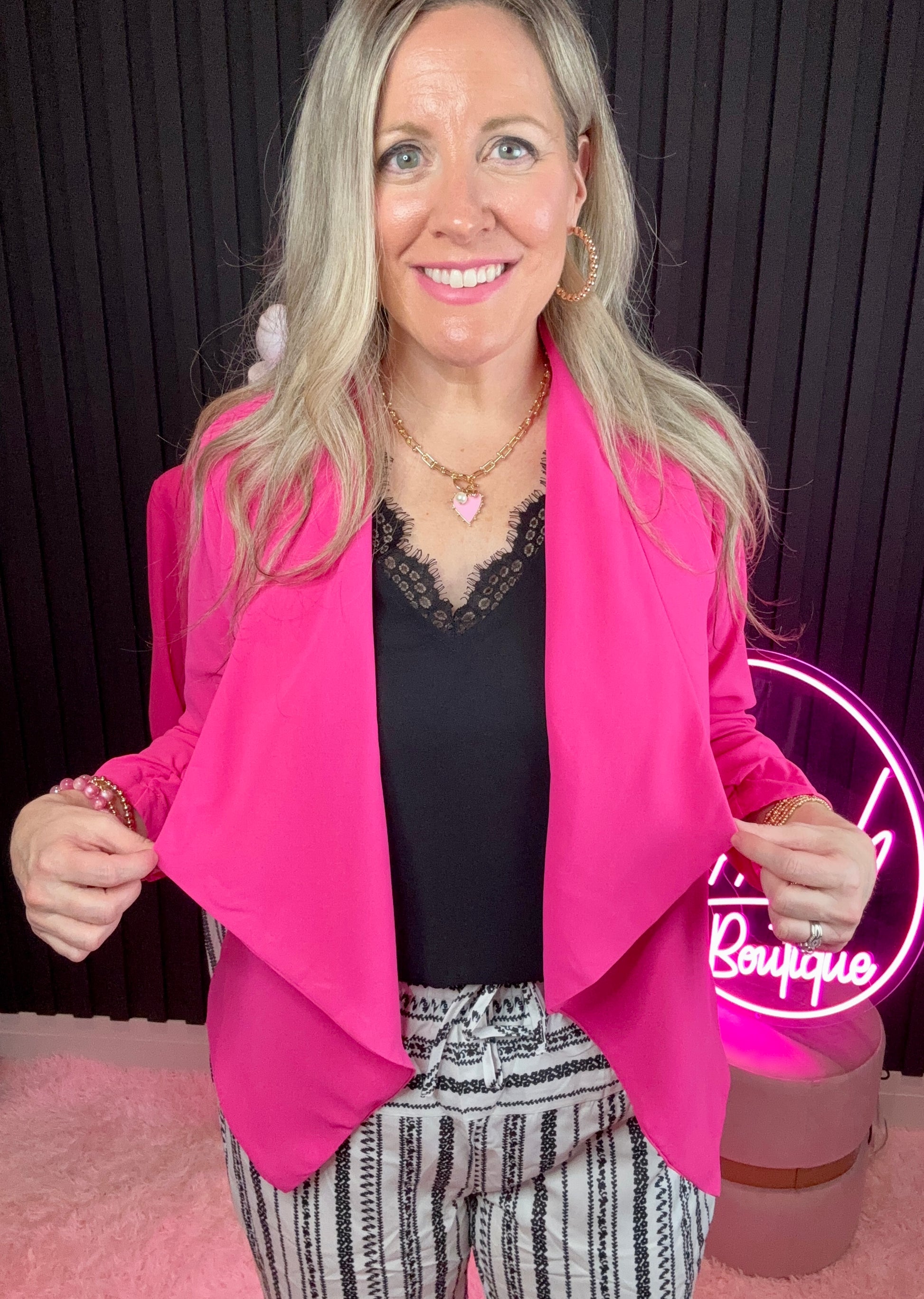 Pairs well with: Our What's Hot Jewelry line pieces. Our Hot Pinkish private label denim for a casual way to style this- think denim, heels & power blazer!